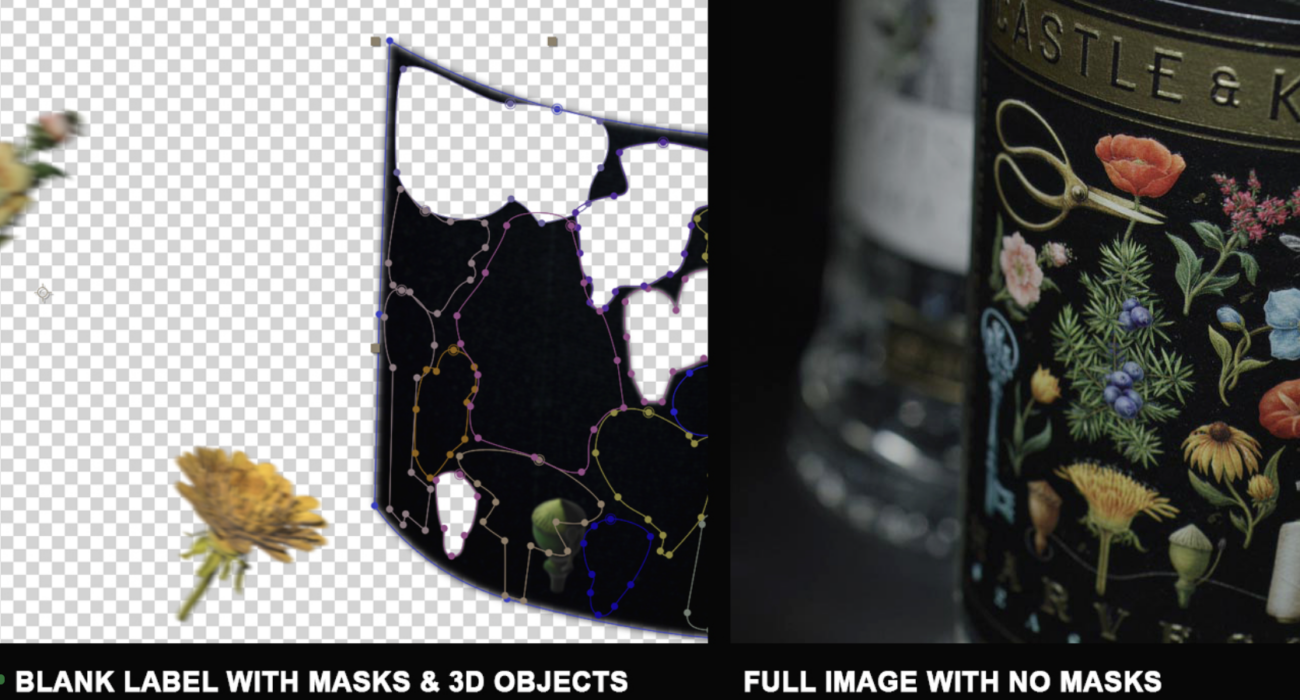 Buzzing with inspiration, Paul mocked up an animatic, and the duo mapped out motion passes with the robot arm. Multiple takes were captured – from front and back label angles, to passes for tracking and transitions. High-res stills of the label were also pulled, retouched, and prepped for animation.