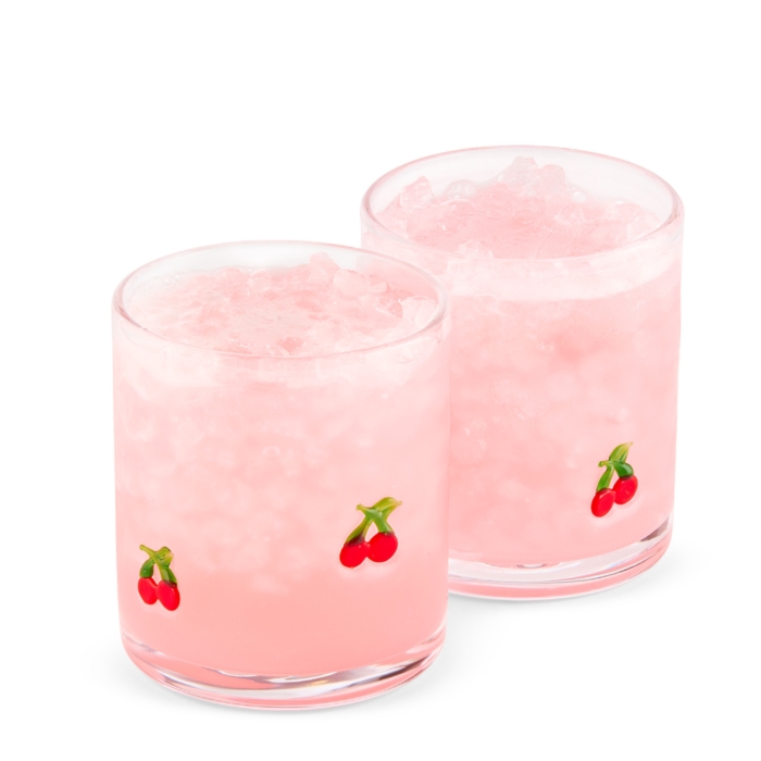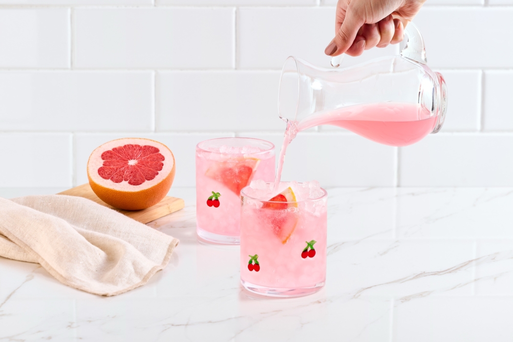 Pink energy drink RedBull can with dynamic water splash and fruit accents photographed in studio for commercial beverage advertising